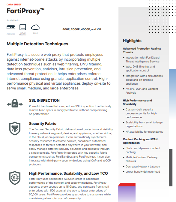 FortiProxy is a secure web proxy that protects employees against internet-borne attacks by incorporating multiple detection techniques such as web filtering, DNS filtering, data loss prevention, antivirus, intrusion prevention, and advanced threat protection. FortiProxy helps to reduce bandwidth demands and optimize the network with content and video caching.