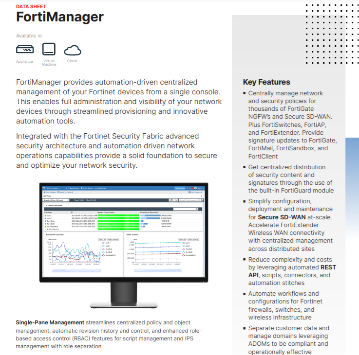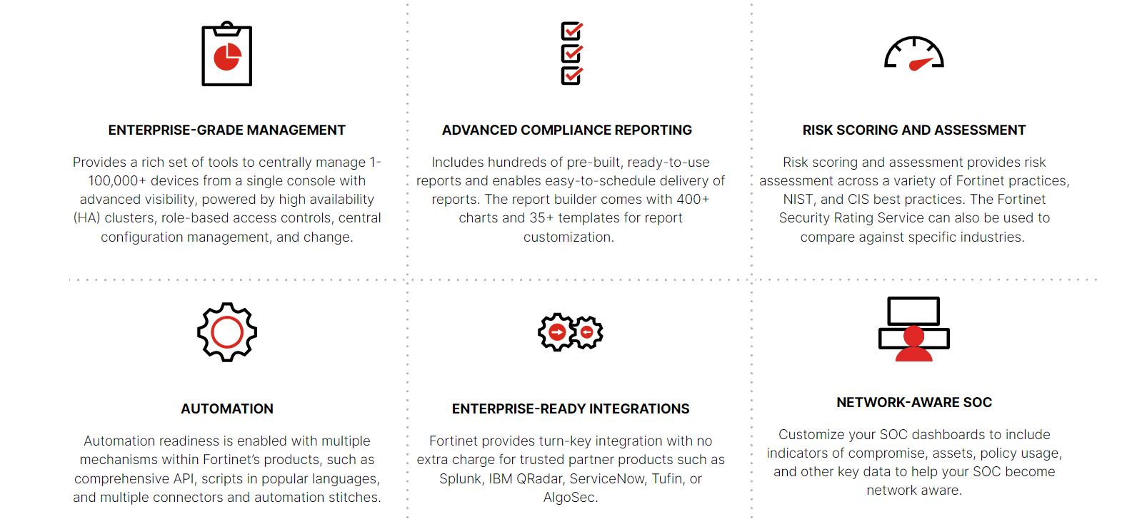 Fortinet security management and analytics provides powerful and simplified network orchestration, automation, and response for on-premises, cloud, and hybrid environments. Fortinet security management and analytics technologies have been tested for more than a decade and is deployed by thousands of customers around the world across all major industry verticals.