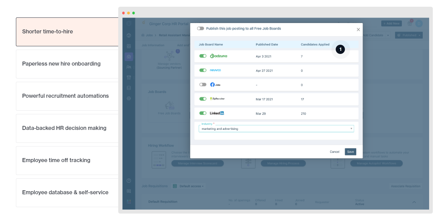 Freshteam is a cloud-based HR and applicant tracking solution offered by Freshworks. The solution helps recruiters source, screen, interview, and hire candidates. It also offers time-off management features for existing employees. Freshteam enables recruiters to generate offers using email templates.