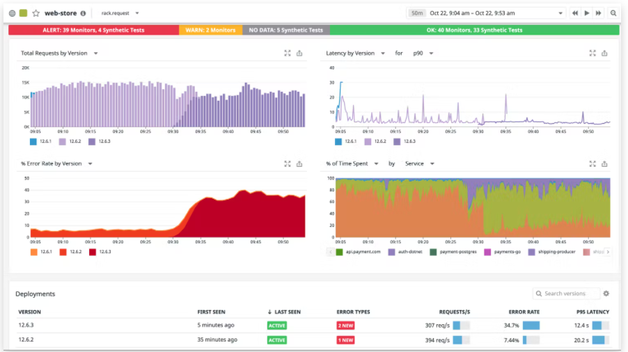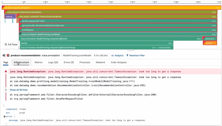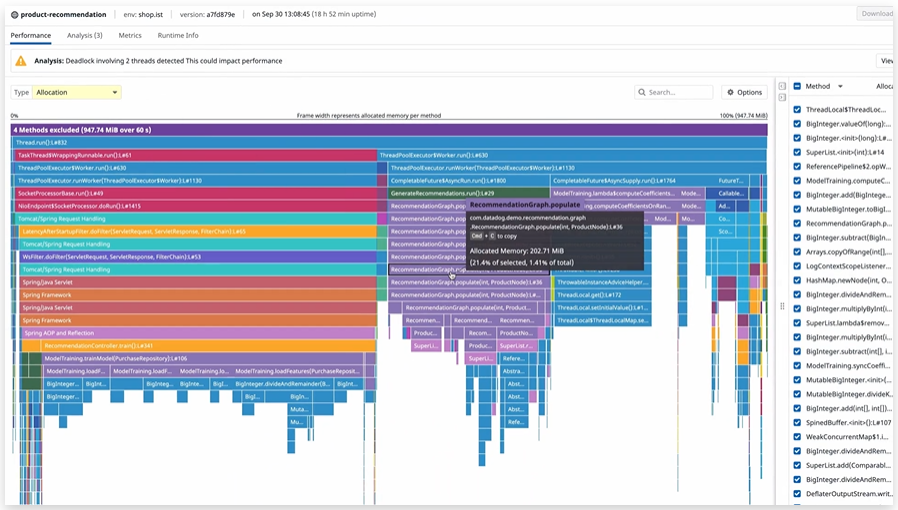 Datadog Continuous Profiler analyzes and compares code performance all the time and in any environment, including production, with negligible overhead. Quickly identify and optimize the most time- and resource-consuming parts in your application code in order to improve MTTR, enhance user experience, and reduce cloud provider costs.