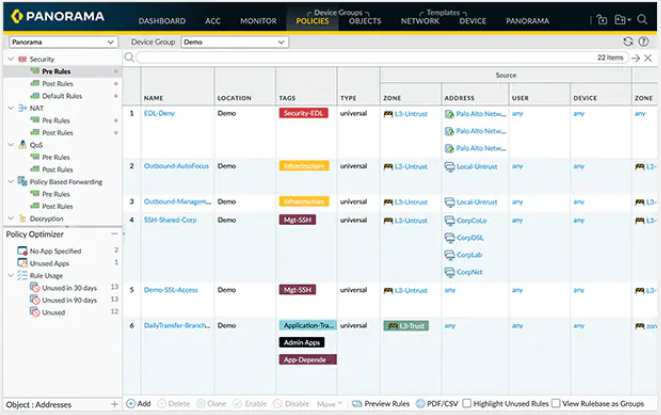 Panorama community security management offers static rules and dynamic safety updates in an ever-changing threat panorama. Reduce administrator workload and improve your security posture with a single rule base for firewall, threat prevention, URL filtering, App awareness, iser identity, record blocking, and facts filtering.
