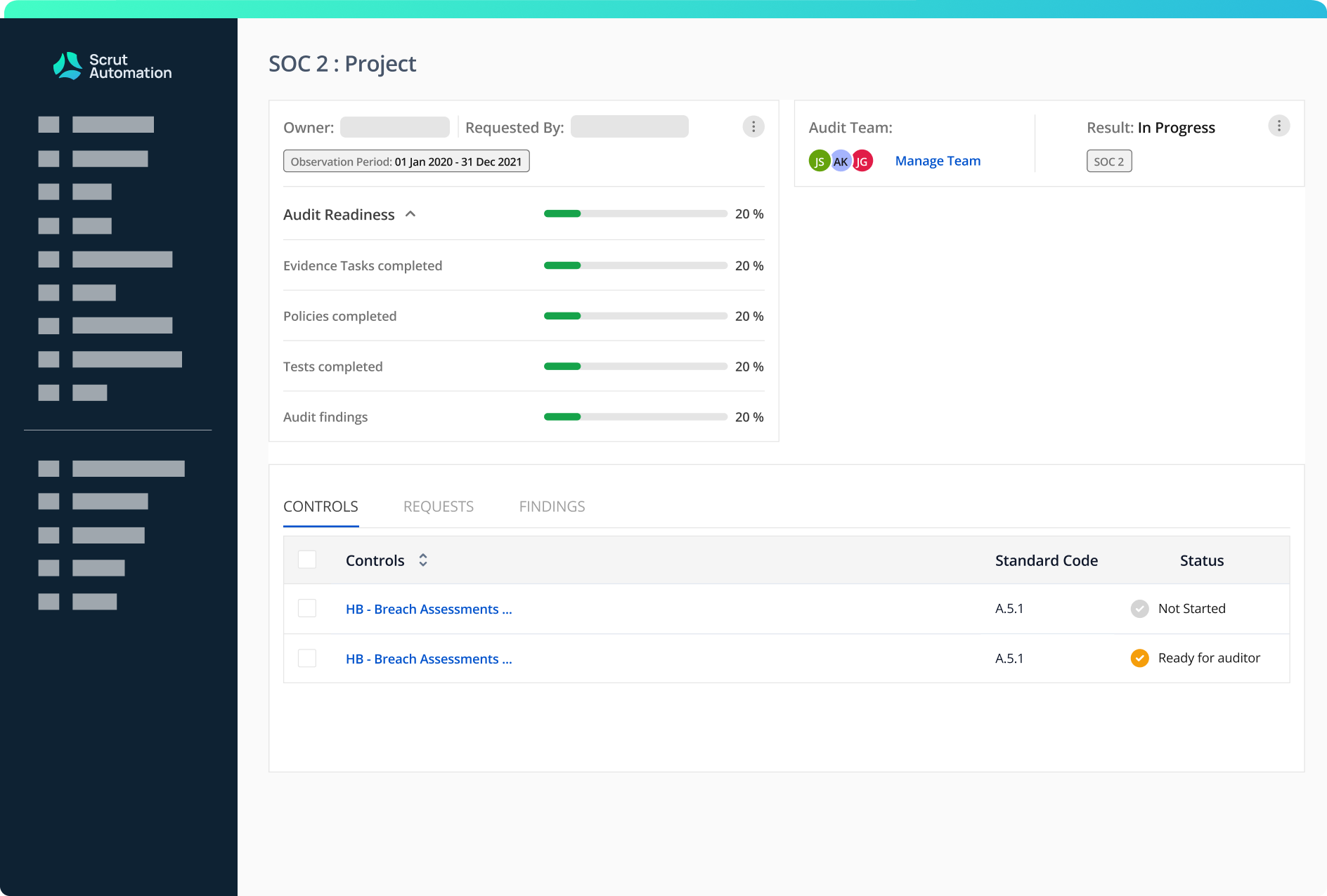 Scrut handles all the infosec compliance standards and internal SOPs in a single-window dashboard. Scrut automatically maps the evidence to applicable clauses across multiple standards while eliminating redundant and repetitive tasks – saving you money and time. Scrut Automation software provides the fastest solution for achieving and maintaining SOC 2, ISO 27001, HIPAA, PCI, or GDPR compliance in a single place so that you can focus on business and leave compliance to us.