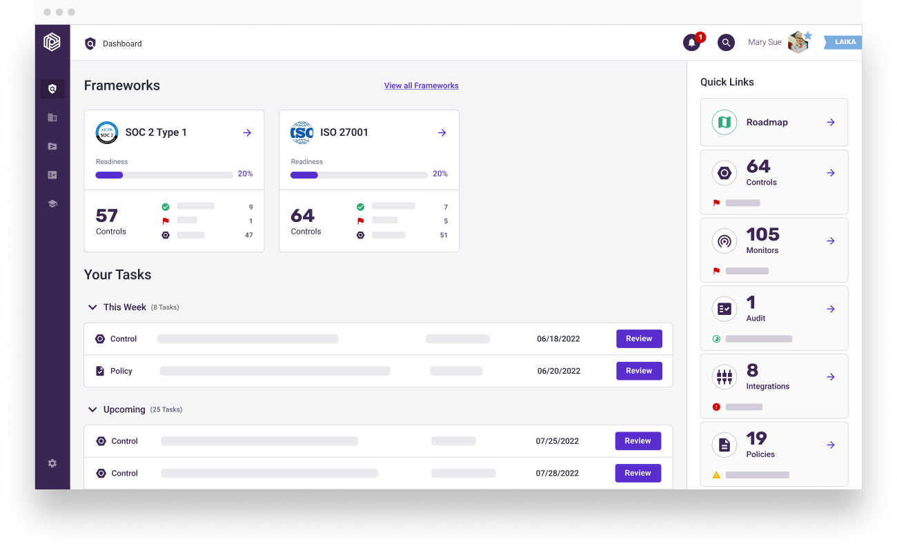 Laika is a platform for building and automating infosec compliance programs, it’s a compliance automation platform, integrated audit, and expert support and services to get and stay compliant with SOC 2, ISO 27001, GDPR, HIPAA, PCI DSS, and other information security and privacy standards.