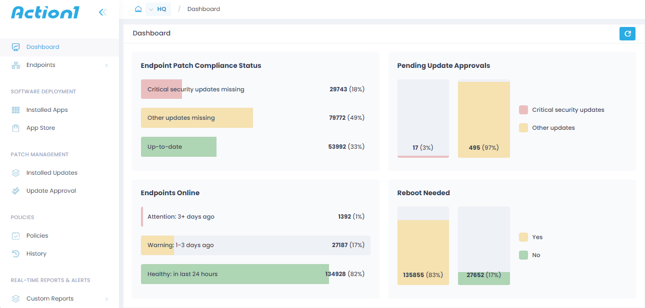 Cloud-Native Compliance Software Solutions for Risk Management and IT Compliance on Distributed Endpoints. Action1 benefits users by automating Windows OS and application patching, Inventory endpoint software and hardware, Managing endpoint security configurations remotely, Deploying security software to servers and workstations, and Demonstrating regulatory compliance to auditors.