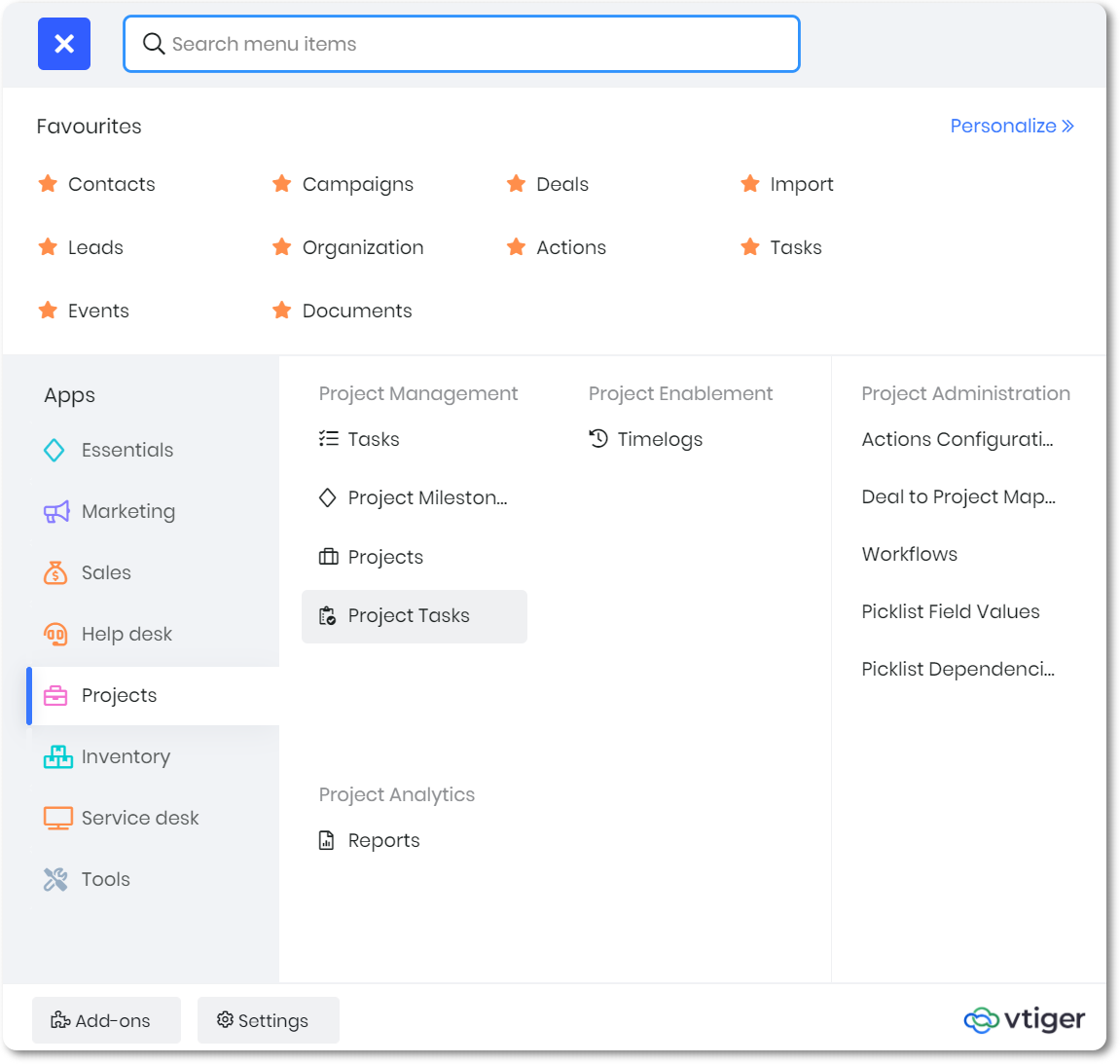 Vtiger All-In-One CRM genuinely provides a plethora of capabilities at a moderate cost. Vtiger is in charge of everything from marketing campaigns to sales force automation and customer care. One View of the Customer - Vtiger CRM gives your sales, customer support, and marketing teams a unified view of your customers, allowing you to see past interactions, campaigns, wins, losses, campaign responses, pending approvals, invoices, cases, projects, and more without switching between screens and products.